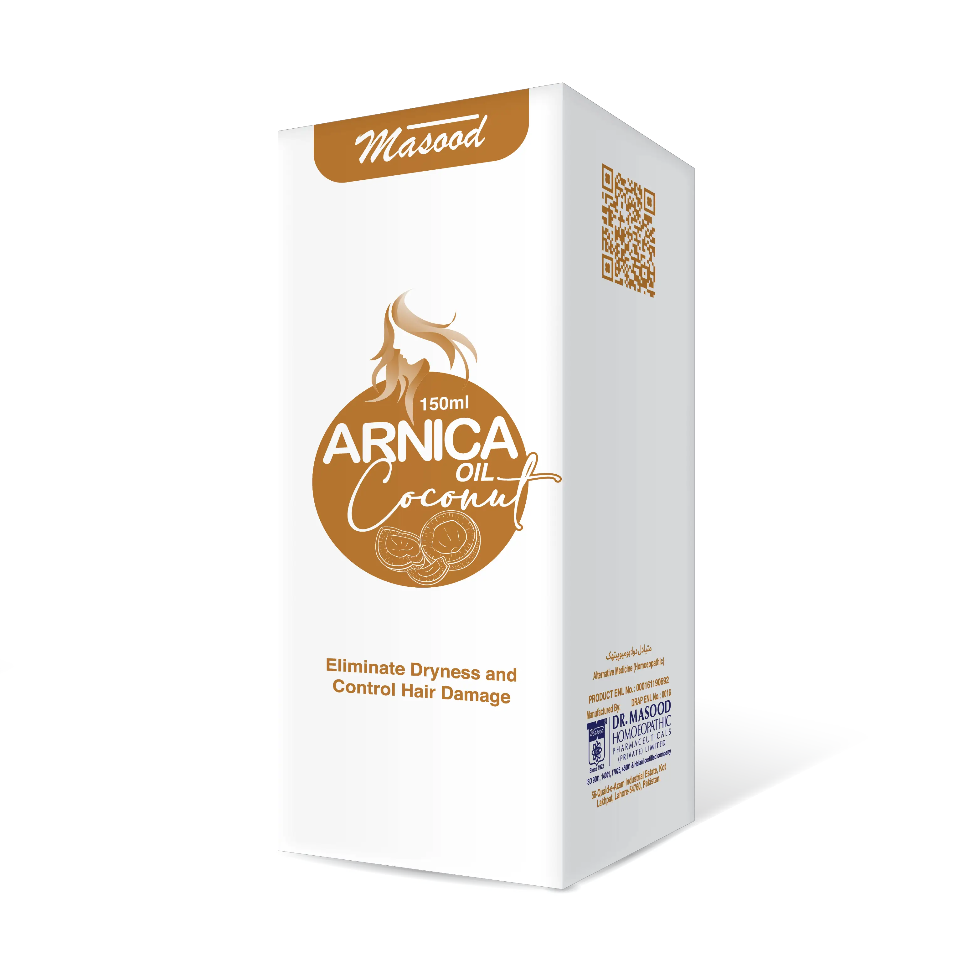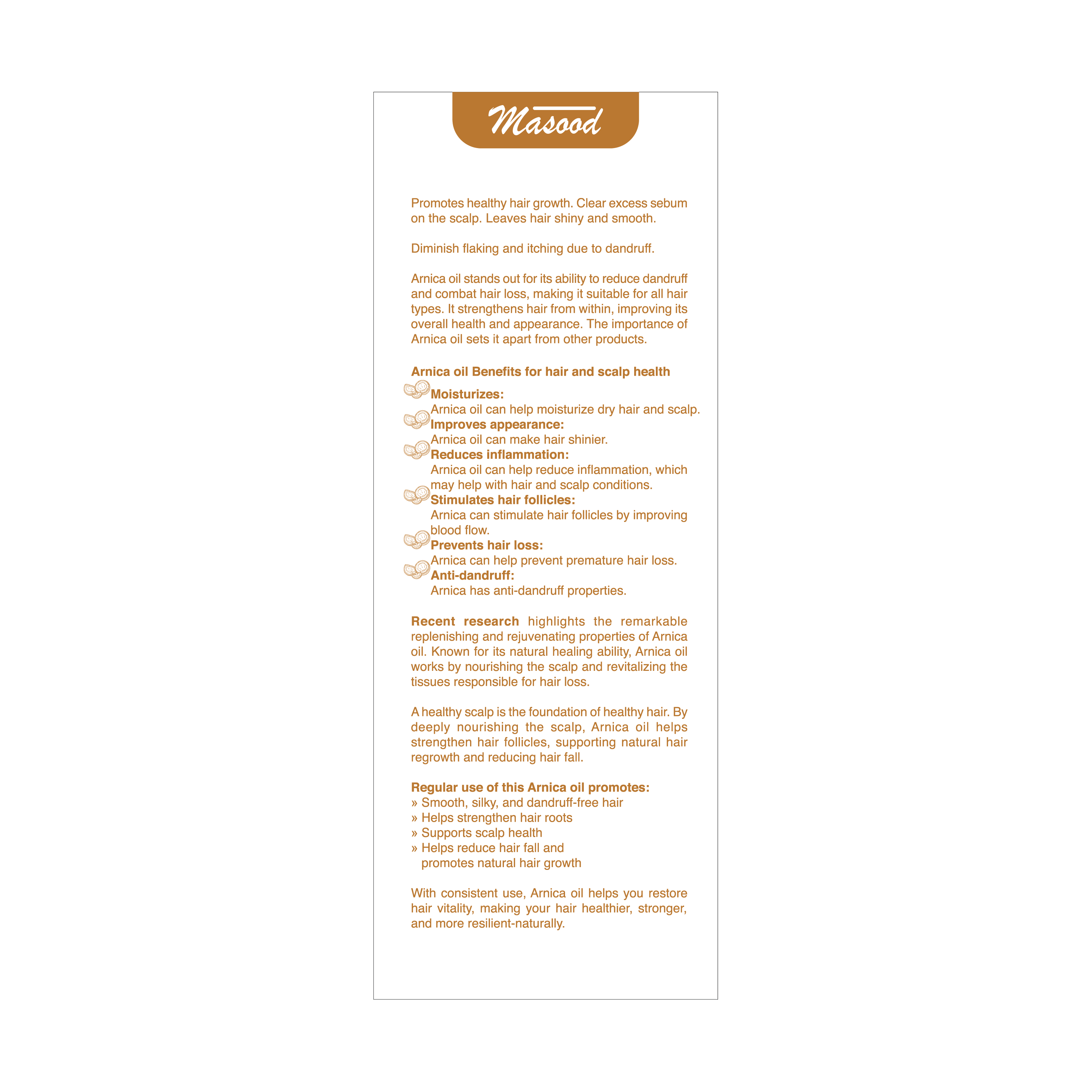Dr. Masood’s Arnica oil coconut promotes healthy hair growth. Clear excess sebum on the scalp. Leaves hair shiny and smooth. Diminish flaking and itching due to dandruff.