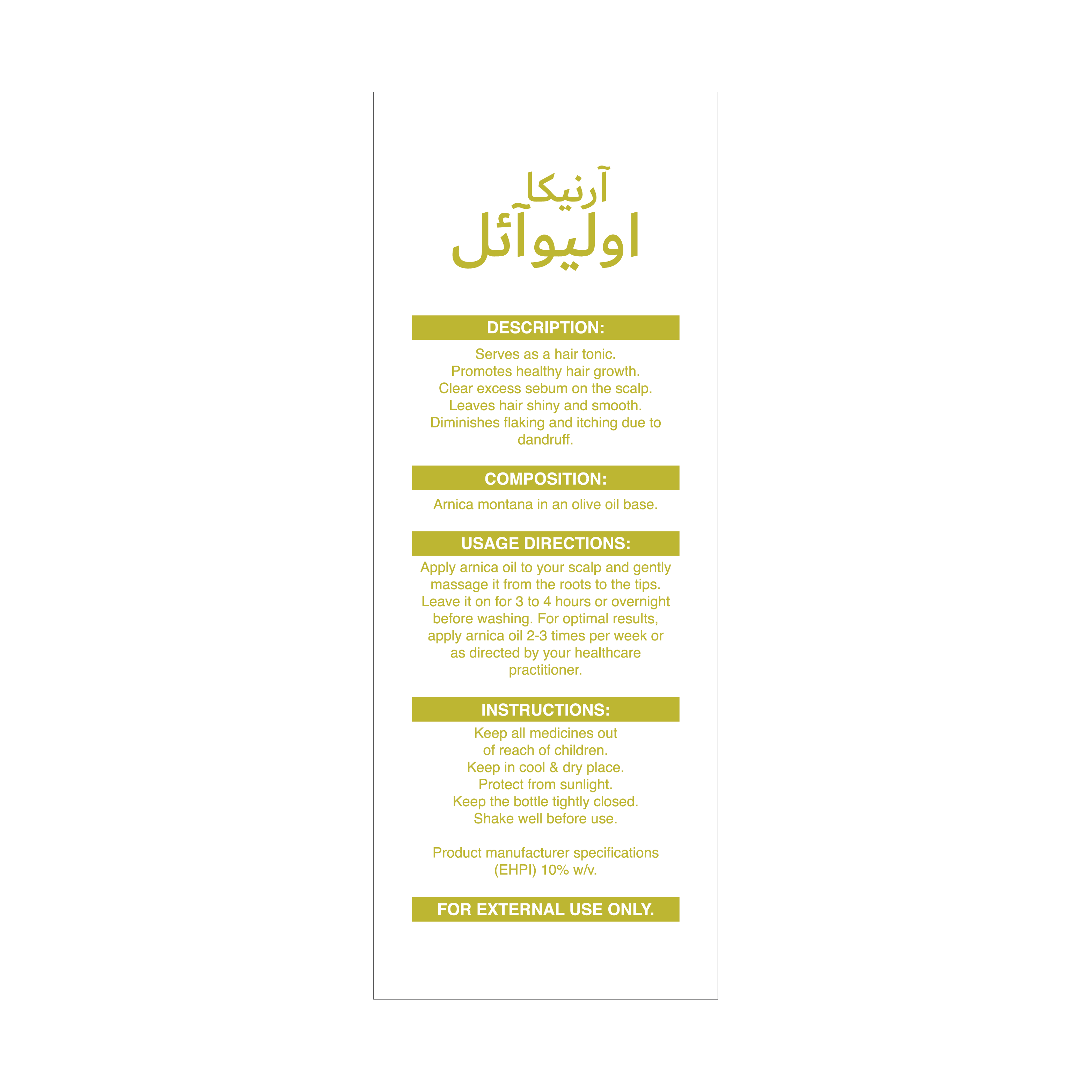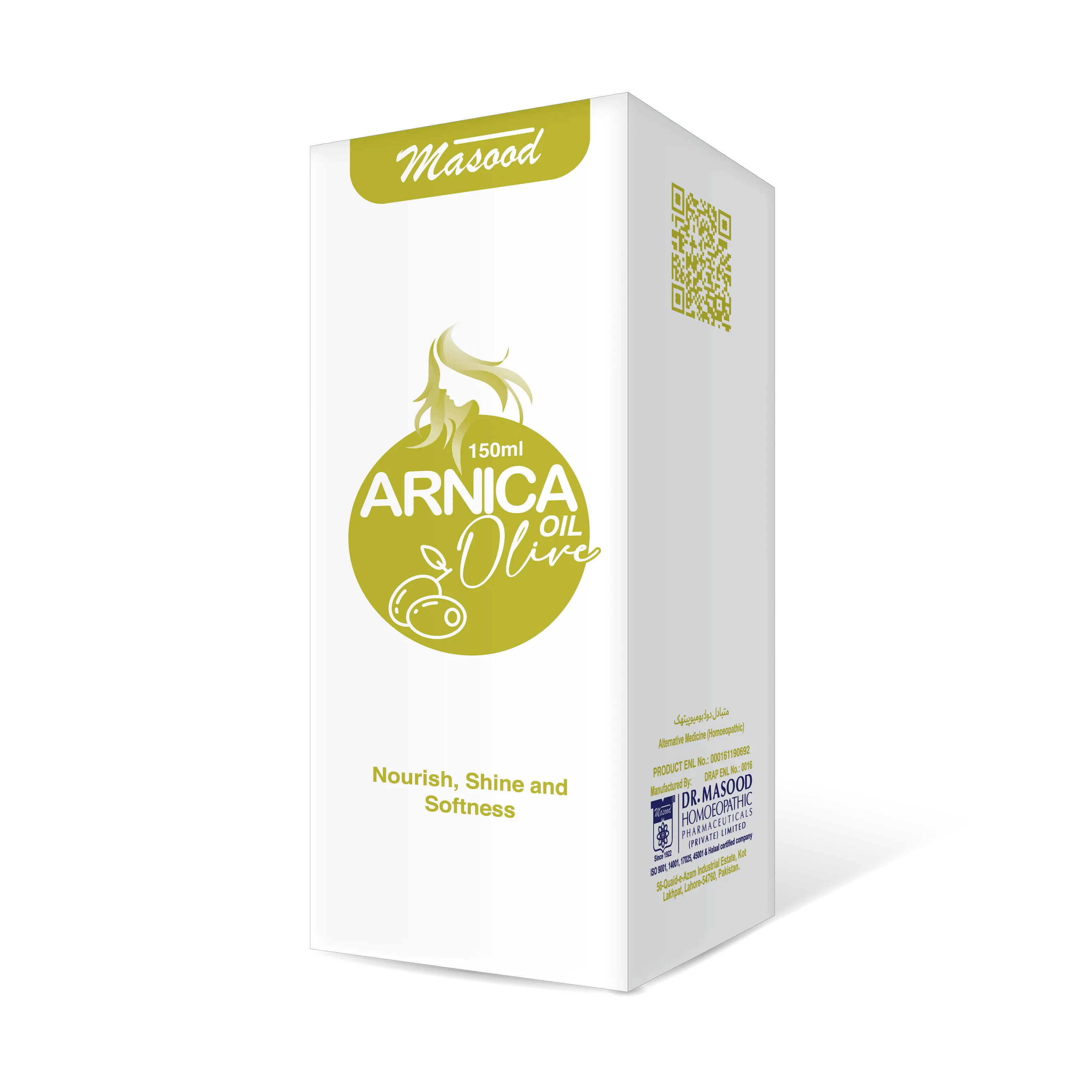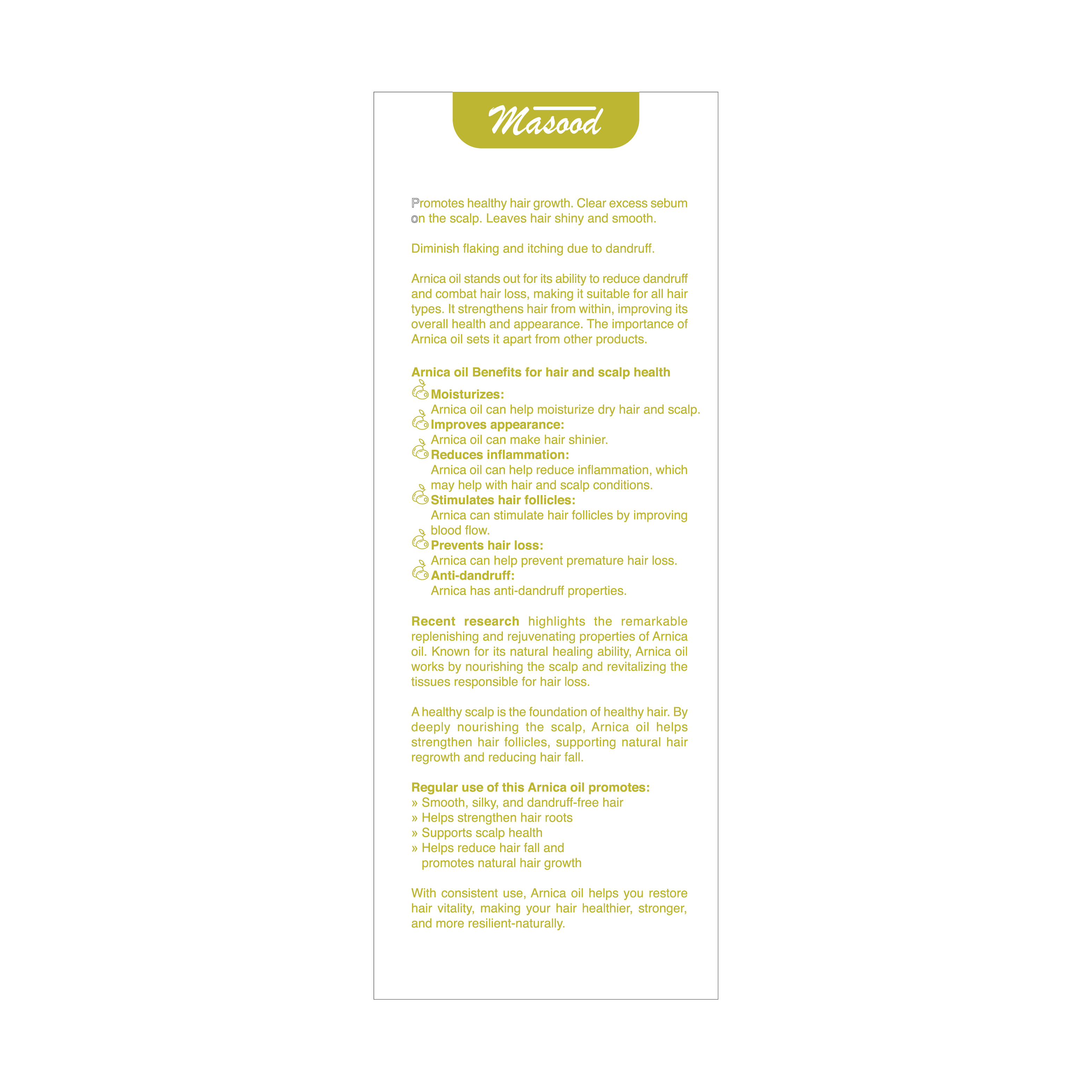 Dr. Masood’s Arnica oil olive promotes healthy hair growth. Clear excess sebum on the scalp. Leaves hair shiny and smooth. Diminish flaking and itching due to dandruff.